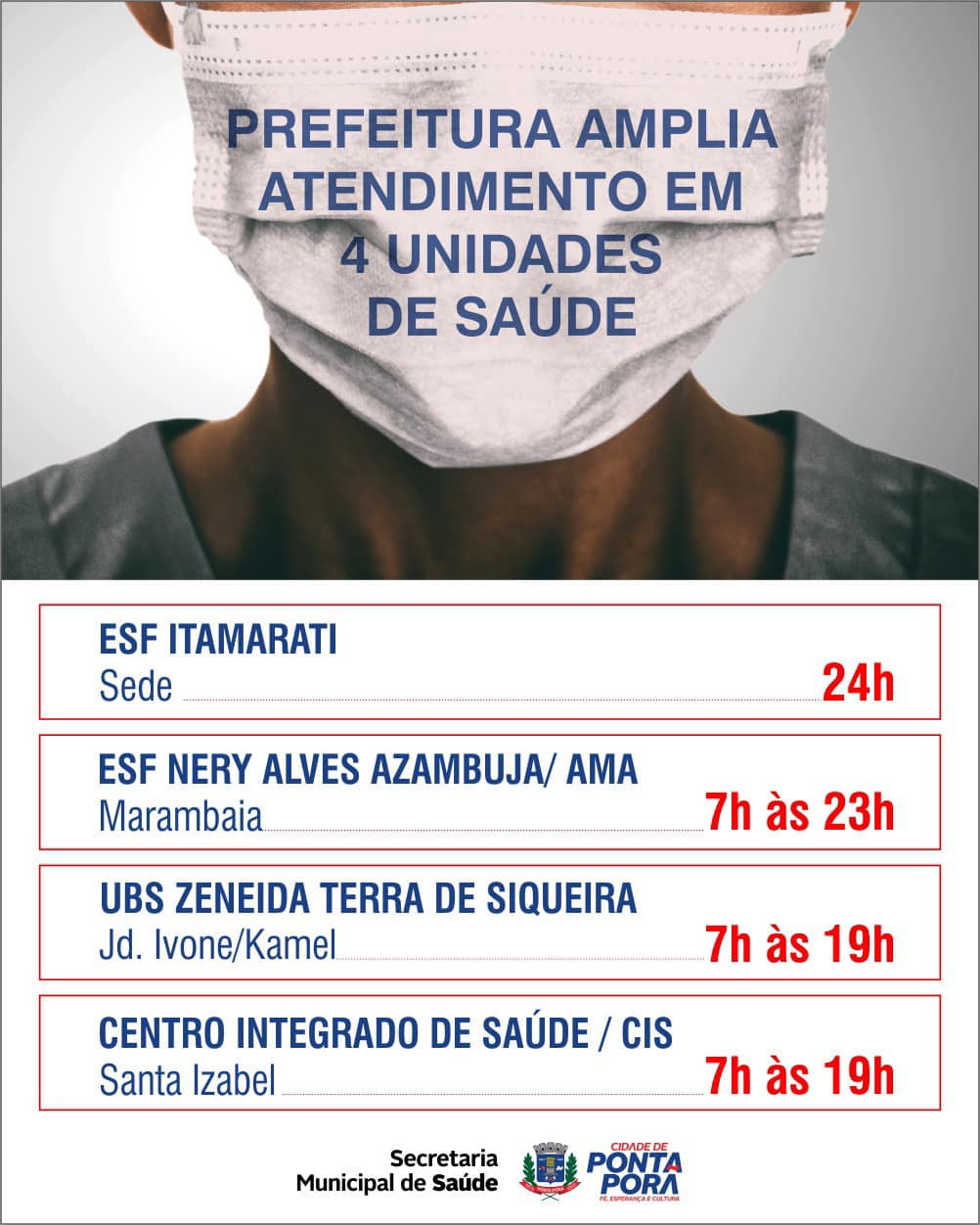 A prefeitura de Ponta Porã está ampliando o horário de atendimento em quatro postos de saúde, visando garantir rapidez e agilidade. No ESF Itamarati, a população tem disponível