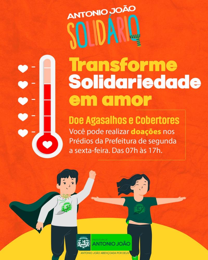 Transforme Solidariedade em Amor Antonio João Solidário: Doe Agasalhos e Cobertores, torne o inverno a estação mais quente de muitas famílias. Prédios da Prefeitura estão