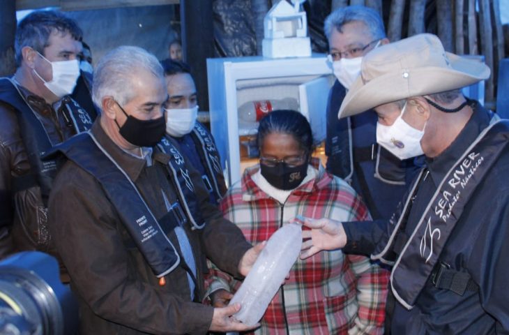 Dona Enaurina, ribeirinha, mostra ao governador garrafa com gelo de sua geladeira nova A chegada da energia elétrica nos confins do Pantanal de Mato Grosso
