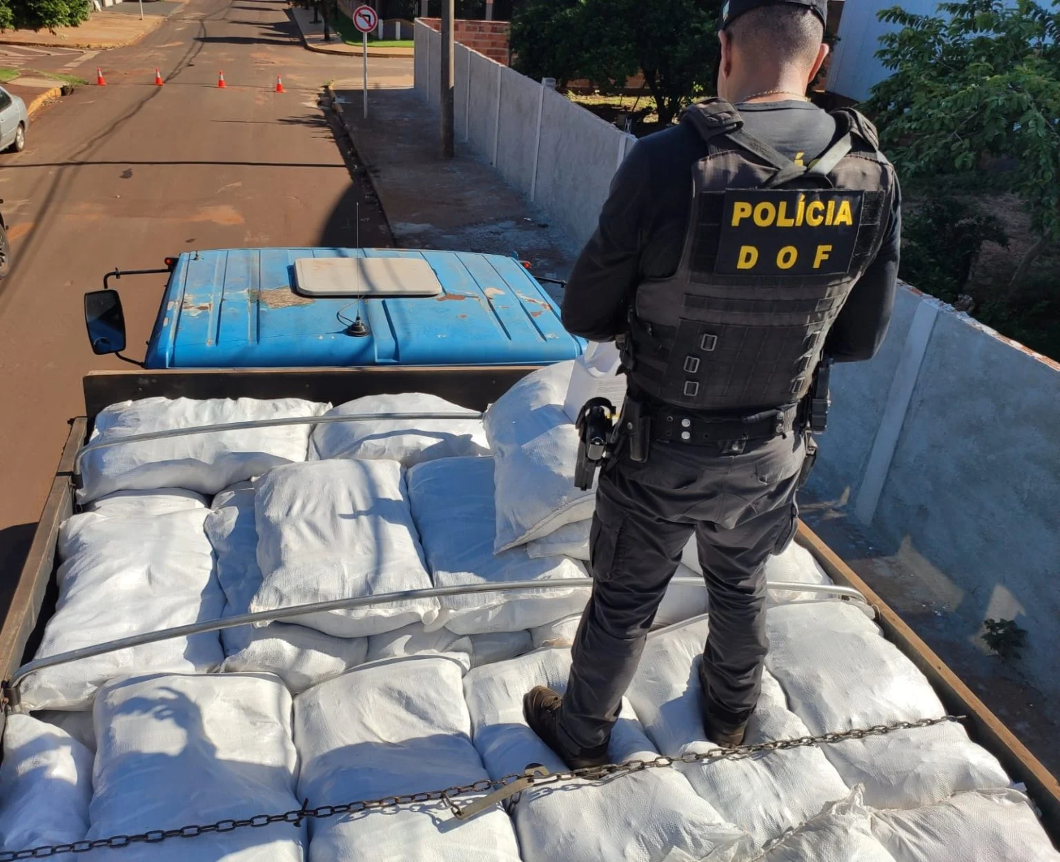 Dourados (MS) – Policiais do Departamento de Operações de Fronteira (DOF) apreenderam, na manhã desta segunda-feira, um caminhão Mercedes-Benz, de cora azul, carregado com 3.536 quilos