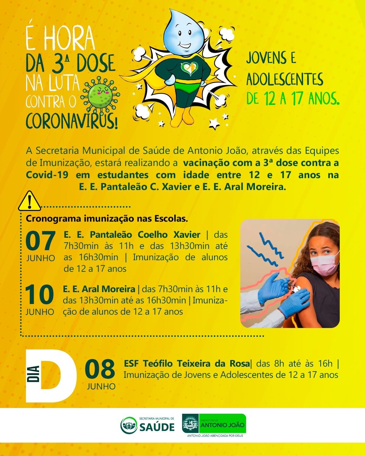 Chegou a hora da 3ª dose do imunizante contra a Covid-19 para adolescentes de 12 a 17 anos! As equipes de Imunização da Secretaria Municipal