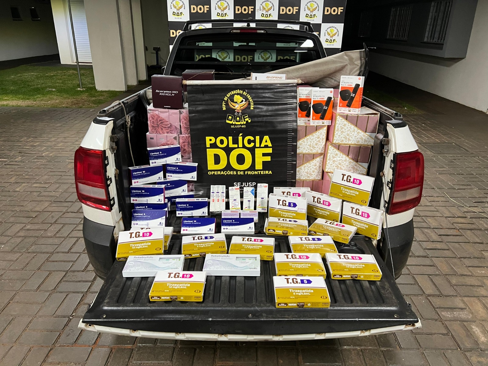 Policiais militares do DOF (Departamento de Operações de Fronteira) apreenderam nesta segunda-feira (30), em Maracaju, um automóvel VW Saveiro com produtos de contrabando e descaminho.