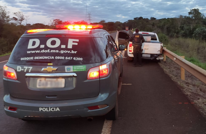 O condutor da S10 desobedeceu à ordem de parada dos militares e evadiu-se pela rodovia. Durante o acompanhamento tático, o homem perdeu o controle da direção causando sérias avarias nos pneus e lataria; abandonou a camionete e fugiu para a mata, não sendo localizado. A viatura Guincho do DOF foi acionada para trazer a camionete até Dourados.