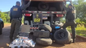 Dourados (MS) – Policiais militares do DOF (Departamento de Operações de Fronteira) apreenderam, na manhã desta terça-feira (27/12), 146 pneus de diversas marcas e tamanhos além de produtos eletrônicos de origem estrangeira.