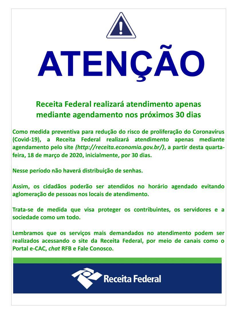 Em função da situação de pandemia do Coronavírus, o Centro de Atendimento ao Contribuinte da Receita Federal de Ponta Porã está atendendo somente os serviços