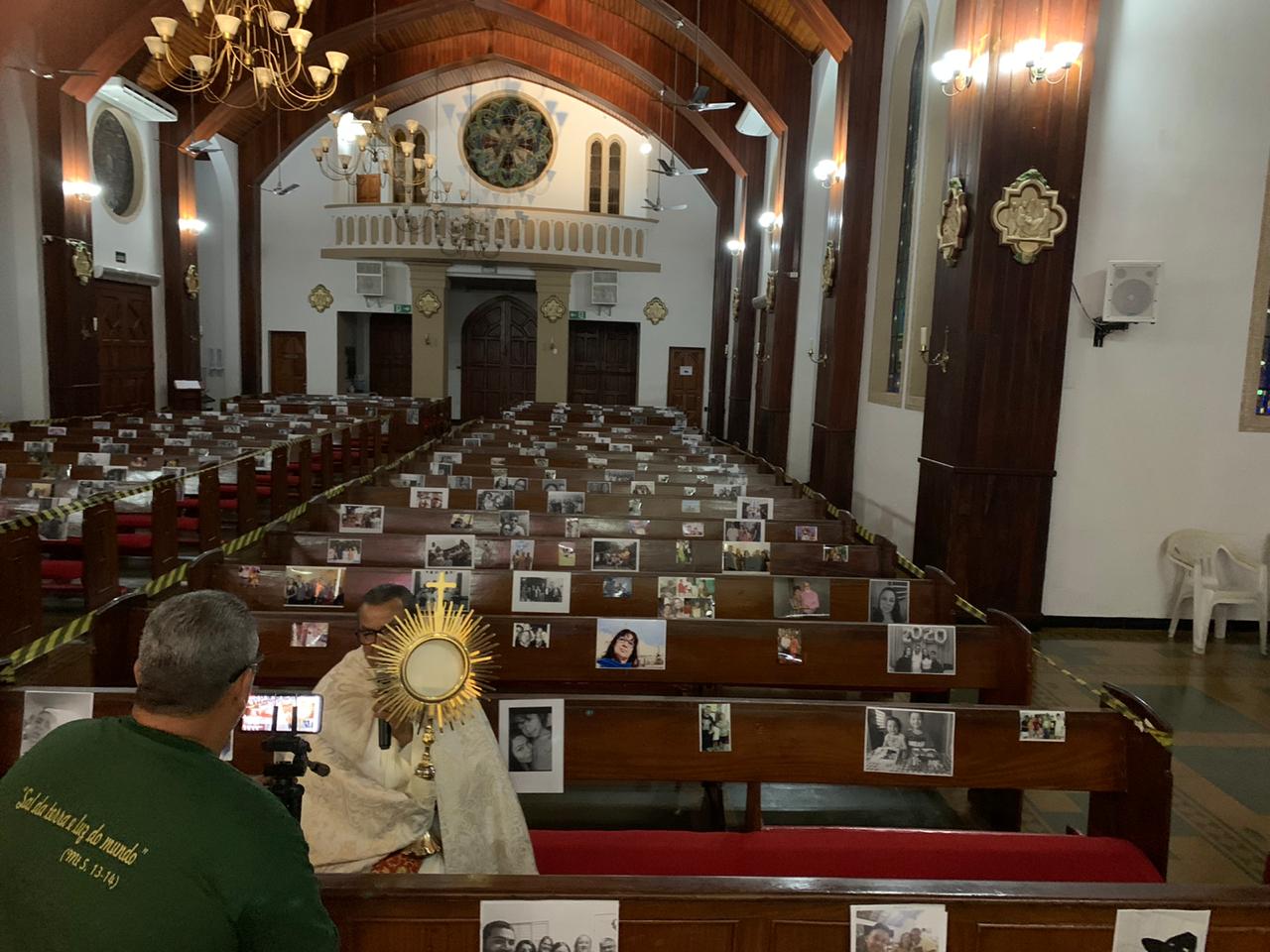 Padre celebra missa com cerca de 500 fotos de fiéis colocadas em bancos de igreja, em Aquidauana (MS). — Foto: Arquivo Pessoal/Padre Paulo Sousa Pelo