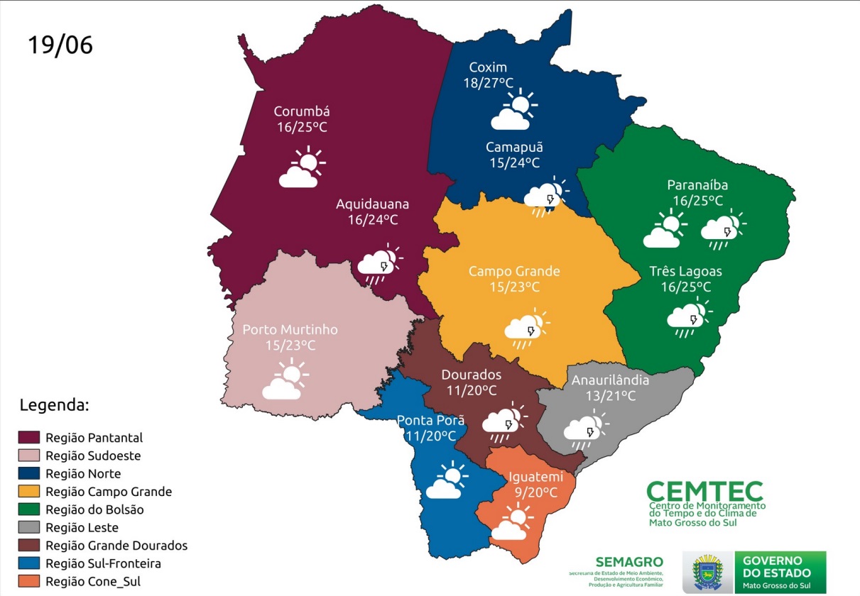 Há possibilidade de chuva neste domingo (19) em Mato Grosso do Sul e de baixas temperaturas nas regiões Conesul e Sul-fronteira, com mínima de até 7ºC.