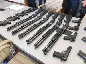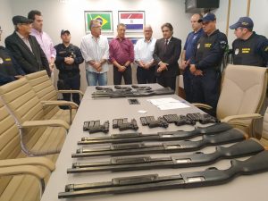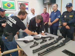 Nesta quinta-feira 04/08, por volta das 11h se reuniram na sala do Gabinete do prefeito Hélio Peluffo Filho, o Vice-prefeito Eduardo Campos, acompanhado do Secretário Municipal de Segurança Pública Marcelino Nunes de Oliveira, do comandante da GCMFron Juliano Luiz Perez Gomes, do Delegado de Polícia Devair Aparecido Francisco – Diretor da Academia de Polícia Civil de Mato Grosso do Sul (ACADEPOL), do Diretor do Departamento de Recursos e Apoio Policial – Jairo Carlos Mendes e efetivo da Guarda Civil Municipal de Fronteira. O evento teve por finalidade a entrega de quarenta e cinco (45) pistolas da marca Imbel, modelo MD7 calibre .40 SW, com dois (02) carregadores cada e seis (06) espingardas modelo 586P, marca CBC, calibre 12, doadas pela Secretaria de Justiça e Segurança Pública (SEJUSP) através de uma parceria entre a Prefeitura Municipal de Ponta Porã-MS e o Secretário Titular Antonio Carlos Videira.