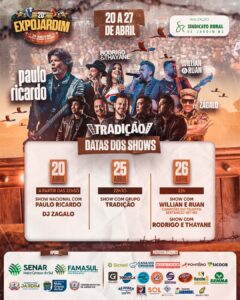 De 20 a 27 de abril, Jardim-MS será palco de um festival de música imperdível, com grandes nomes da cena nacional e regional. Prepare-se para uma semana de muita animação e shows para todos os gostos!