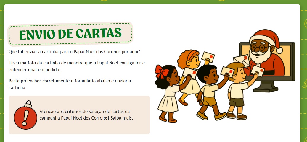 O prazo para envio termina na sexta-feira (14). As cartas não podem conter endereço, telefone ou foto da criança, e cada participante pode enviar apenas uma cartinha. Não há sorteio.
