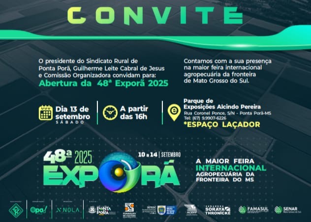 O presidente do Sindicato Rural de Ponta Porã, Guilherme Leite Cabral de Jesus, e a Comissão Organizadora convidam toda a população para prestigiar a feira. A expectativa é que o evento atraia produtores rurais, investidores e visitantes de toda a região e do país vizinho, Paraguai.