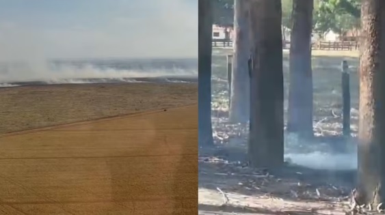 Um incêndio atingiu uma plantação de eucalipto e se espalhou por quatro fazendas próximas a Campo Grande, na tarde deste sábado (23). Funcionários das fazendas e de uma usina auxiliam os bombeiros no combate ao fogo.