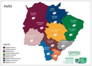 Nas regiões sudoeste, Pantanal e norte de MS, as temperaturas mínimas ficam entre 22°C e 23ºC, e as máximas entre 28°C e 29ºC. Na Capital, a previsão é de mínima de 21°C e máxima de 26°C.