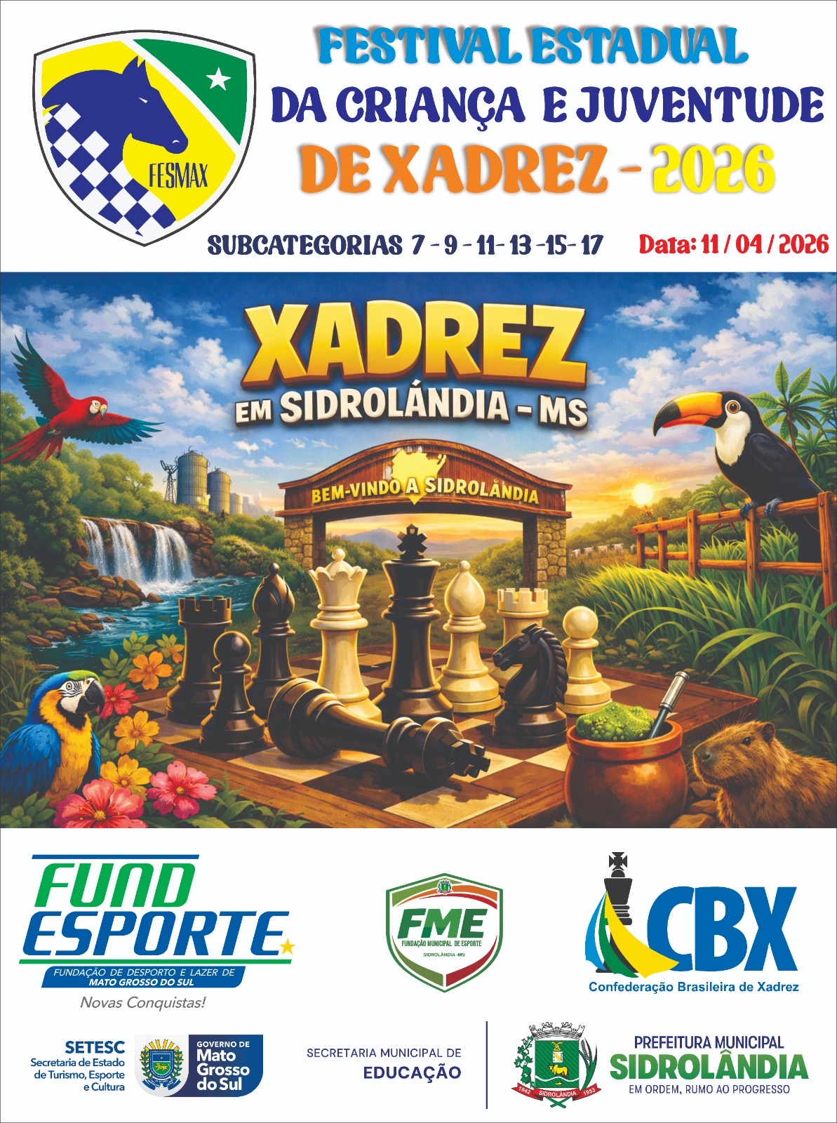 Estratégia, concentração e raciocínio lógico ganham o centro do tabuleiro em Sidrolândia. Neste sábado, 11 de abril, a partir das 8 horas, o Tatersal César Neto de Menezes, localizado no Parque de Exposição, será o palco do Festival da Criança e Juventude de Xadrez 2026. O evento marca um momento de renovação para o esporte no município e no estado.